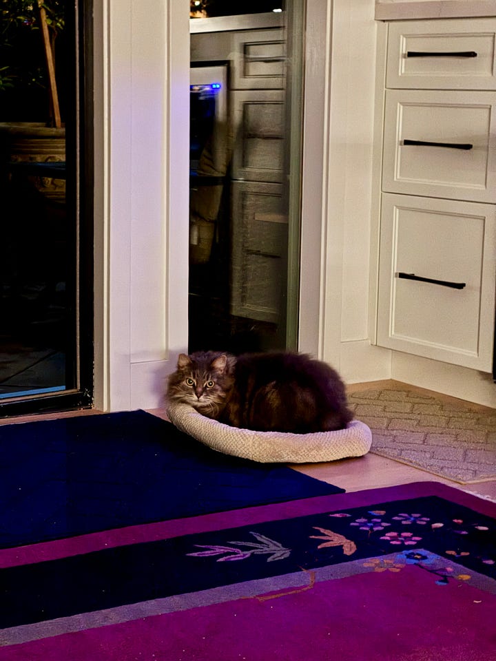 For those keeping track, Floofles has been a little angel, coming inside out of the big rains all last week. I’ve tried giving her all kinds of pet beds and she just shuns them. I had the idea to put a folded towel on the floor, and she curled up on it and melted my heart. Then my girlfriend gave me this cute terry cloth kitty bed and she loves it!