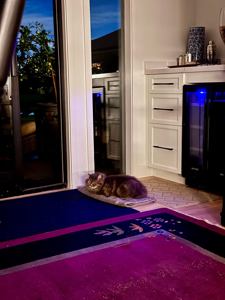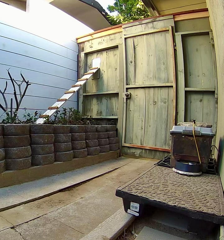 While traveling I use my raccoon-proofed feeder and I get notifications when she’s there and dispense remotely. We set up the new atrium for her and she is the only critter who can access it, along with another feral kitty, Sneaky.