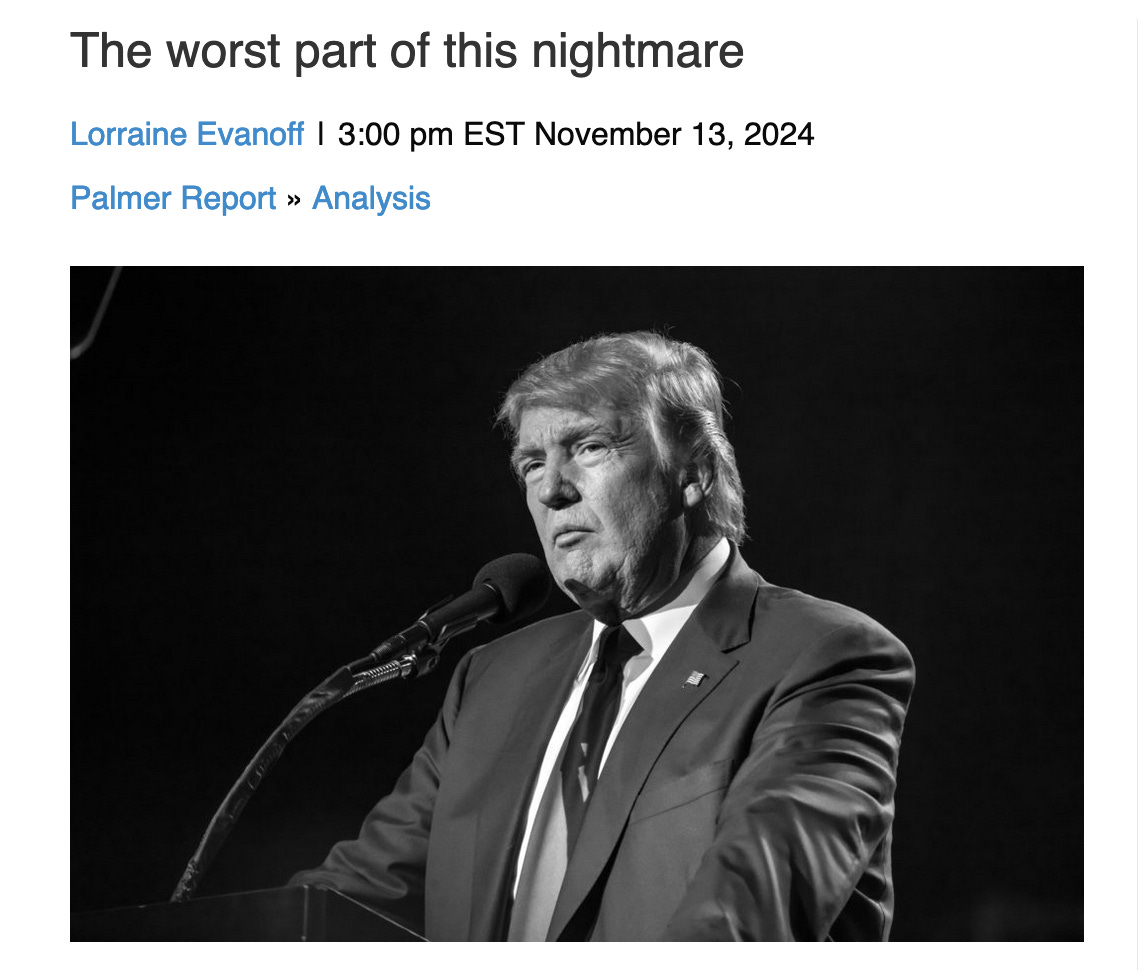 The worst part of this election is that this nightmare was supposed to be OVER. But now we see that the nightmare is here to stay. Putin has fully taken control of global rightwing extremism and billionaires. We thought America had cracked the code, winning and overperforming in every election since 2016. Even though we now know it was closer than initially thought, with the assist from tech billionaire controlled corporate media and Russian interference, they bullied us into forcing Biden out and let the sexism card sway the results again.