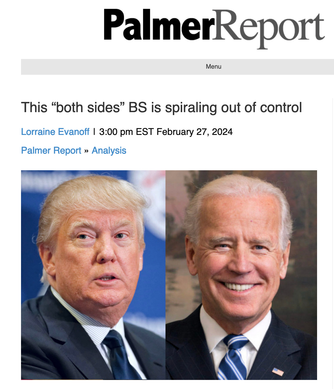 This “both sides” BS is spiraling out of controlElection interference is coming only from the RIGHT Lorraine EvanoffFeb 28, 2024753512ShareLorraine Evanoff | 3:00 pm EST February 27, 2024Palmer Report » AnalysisREAD PALMER REPORTShareTo receive new posts from Lorraine, consider becoming a FREE or paid subscriber.SubscribePreviousNext